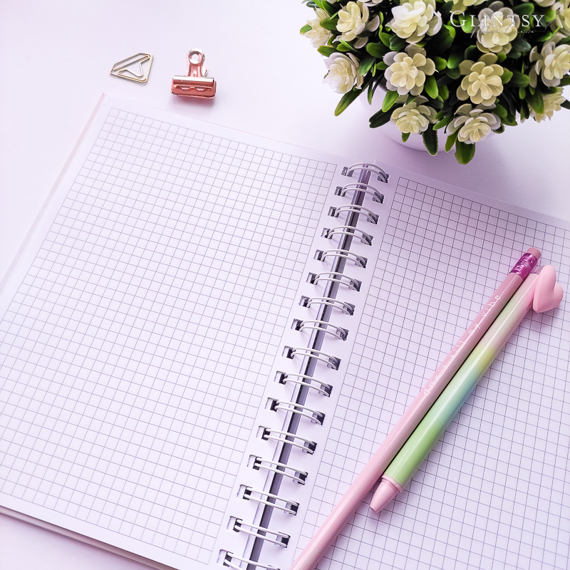 Este caderno A5 tem capa dura e está disponível em tons de azul ou rosa. O interior pode ser liso, pautado (linhas) ou quadriculado, para se adaptar às suas preferências.