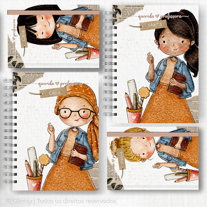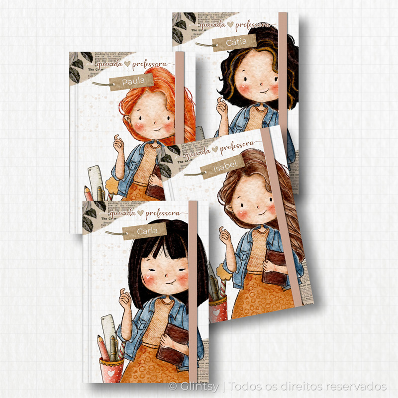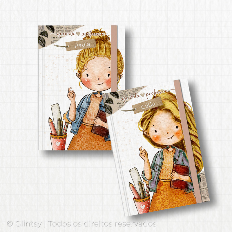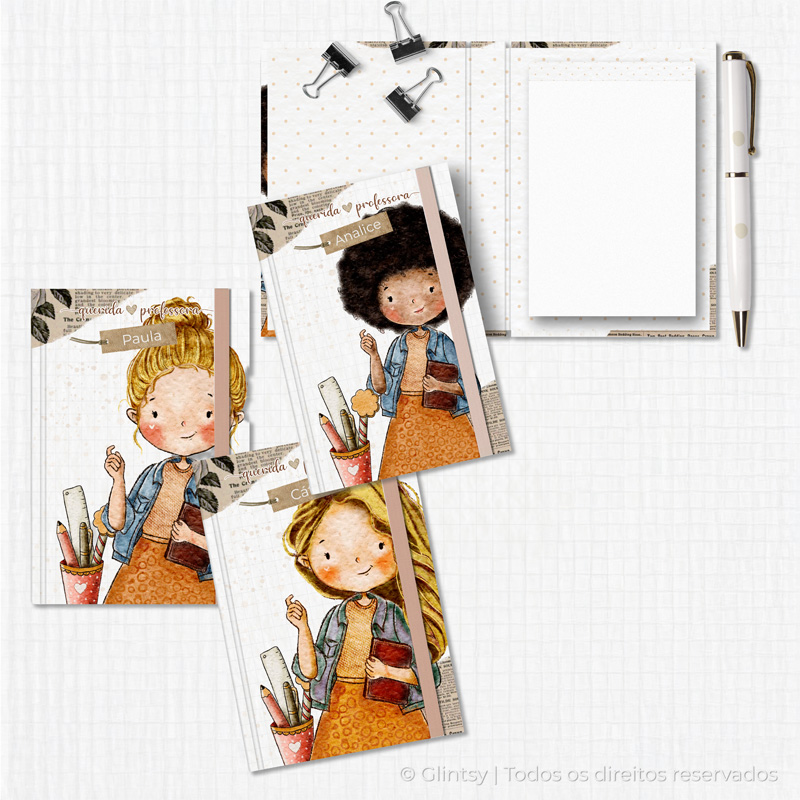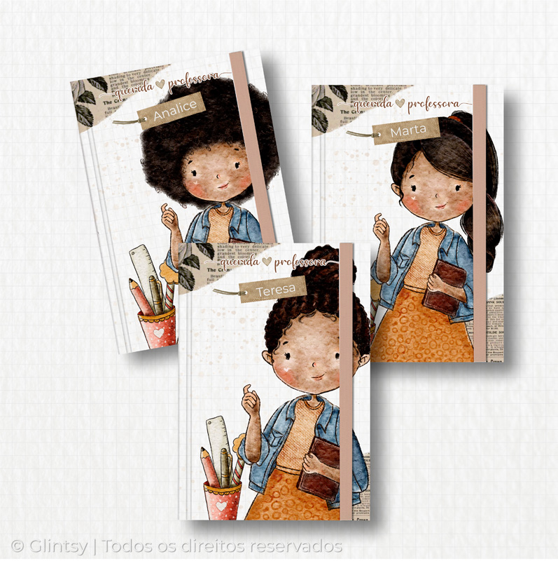 Cada capa traz uma ilustração delicada de professora, podendo ser personalizada com o nome.