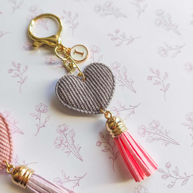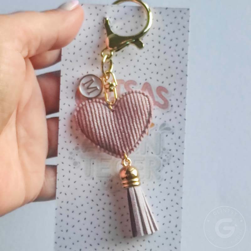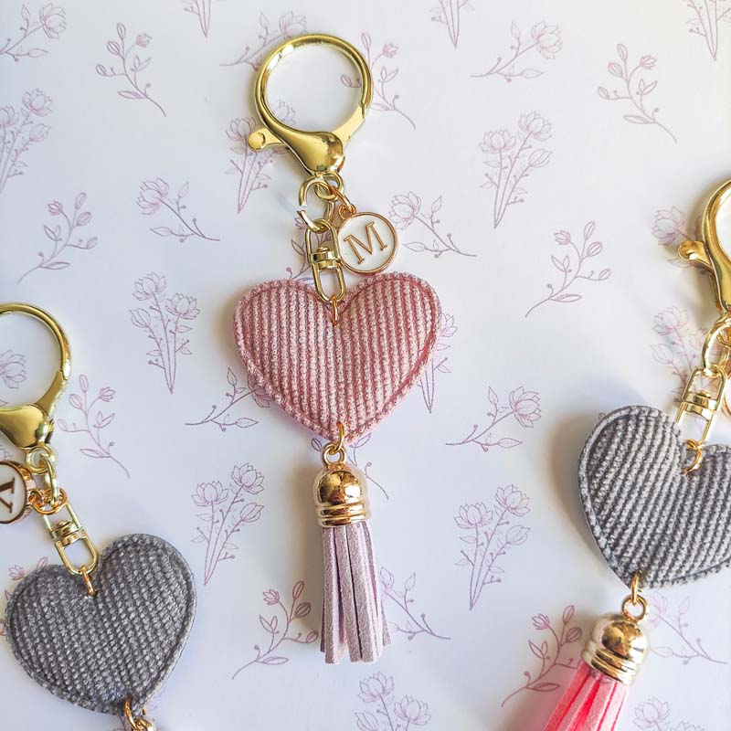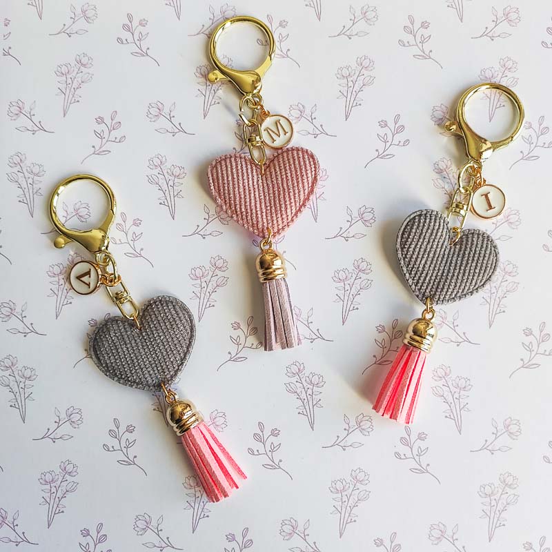 Composto por um coração em tecido artesanal, uma medalhinha com a inicial personalizada e um tassel decorativo, este porta-chaves é também uma excelente opção de presente simbólico e cheio de significado.
